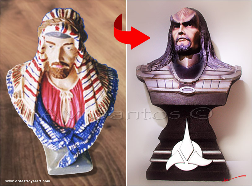 Mom had this cheap white statue clay bust on top of the kitchen counter. Since she was so religious at first I thought it was a Christ figure then I realised it was a regular arab sheikh. Since I had no model kit to do I asked mom if she would let me paint the figure, I did. Then I saw the new Klingon versions from Star Trek movies, specially the third sequel, The Search for Spock. Where Lloyd’s Kruge inspired me with his interpretation of the Klingon Commander.